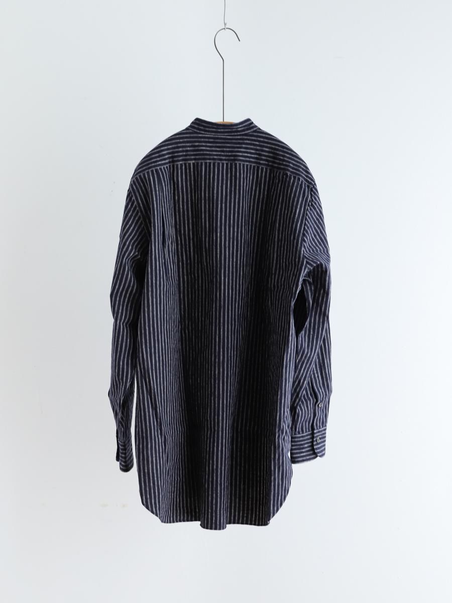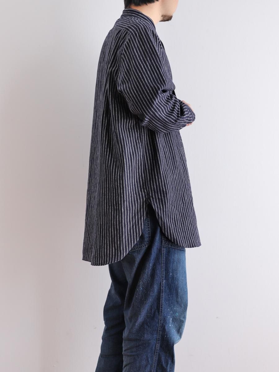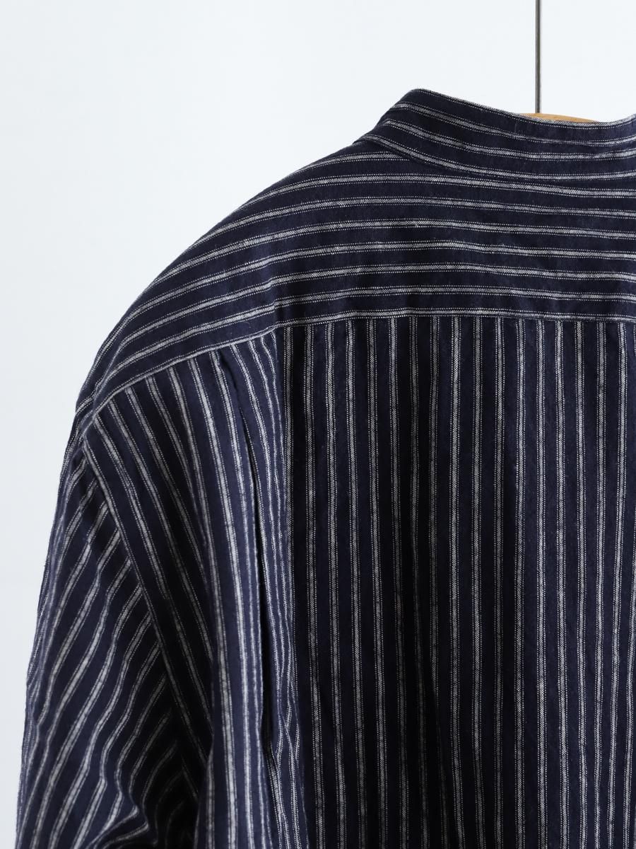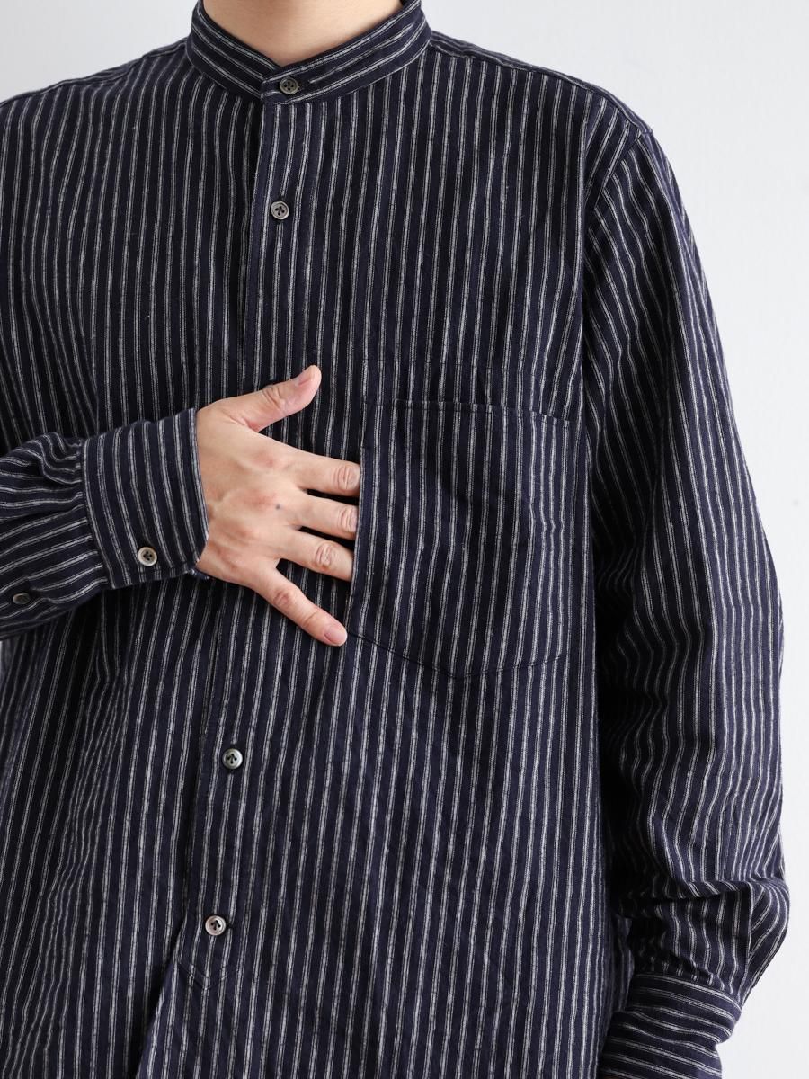 非常に細かなピッチのステッチライン、貝ボタンを鳥足付けするなど、ドレスの要素を取り入れることでカジュアルシャツに上品さをプラスしています。