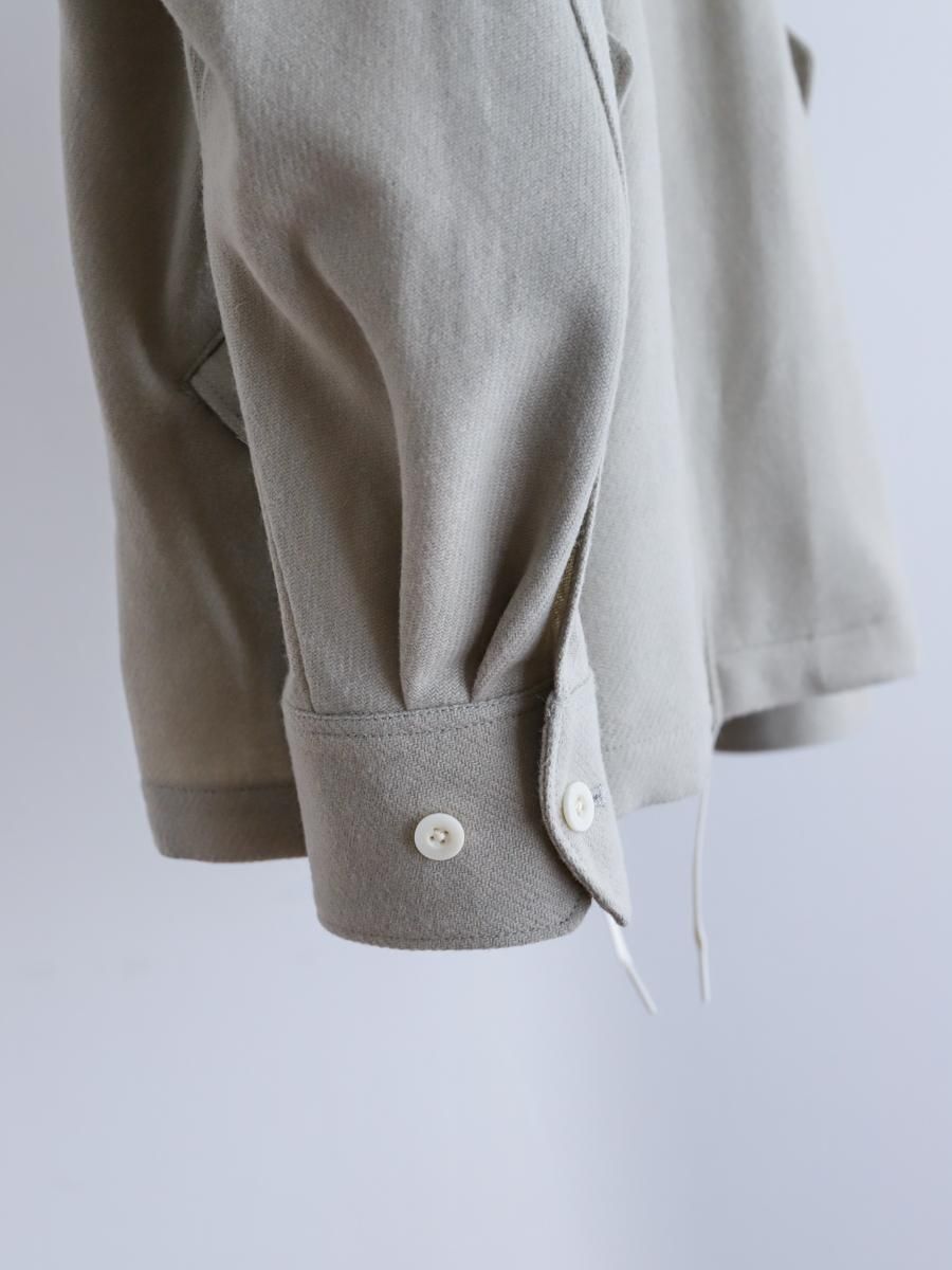 作業をしやすいように袖の可動域を広げたラグランスリーブ、前振りのついた袖は着た時に最も美しく見えるような立体的なパターンを採用しています。
