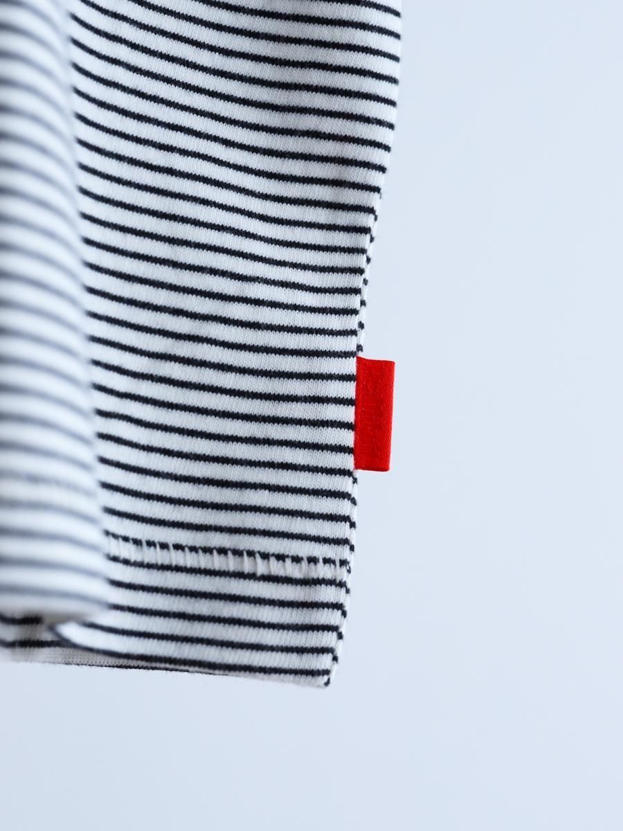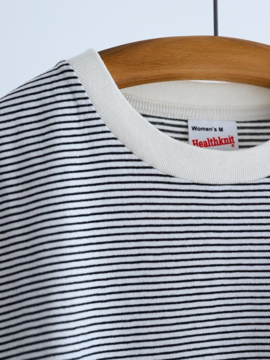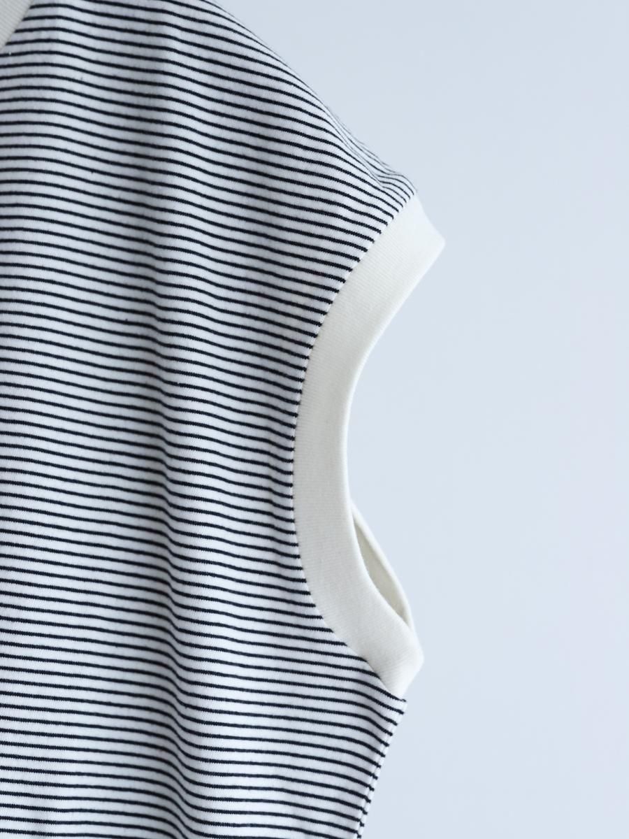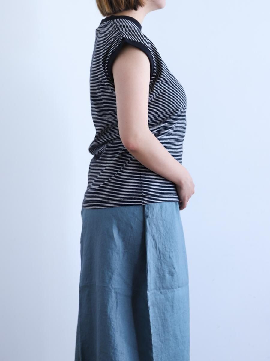 細いボーダーで、滑らかな綺麗めの生地感のTシャツ。
