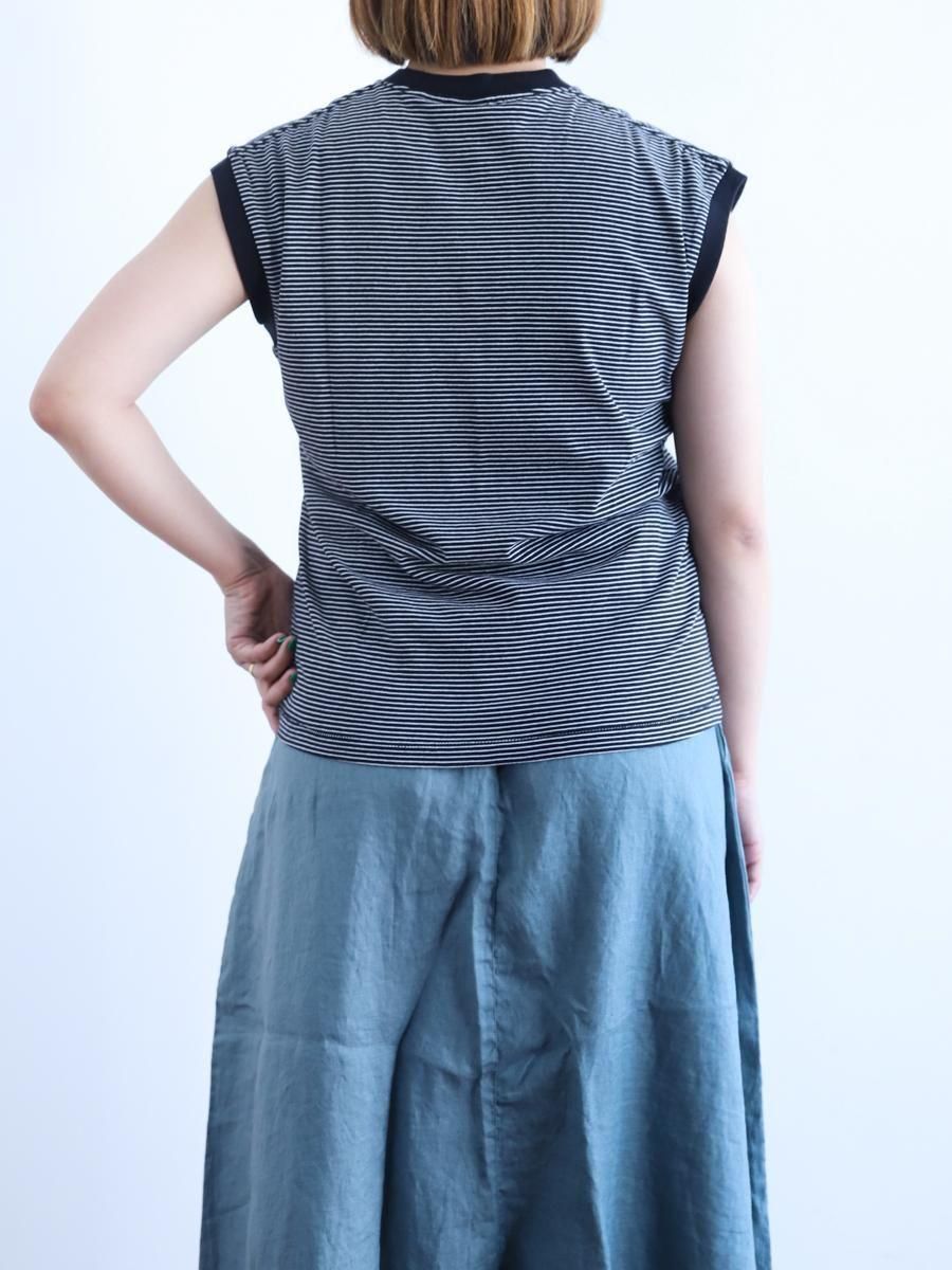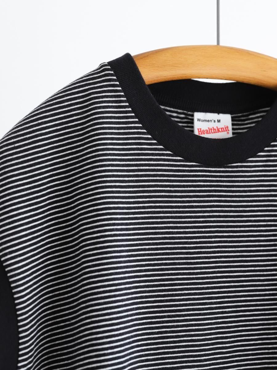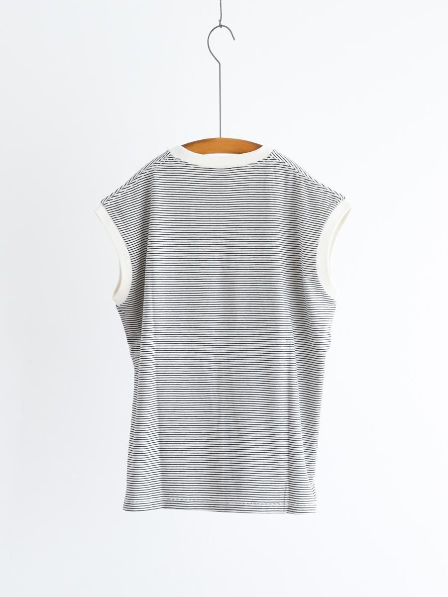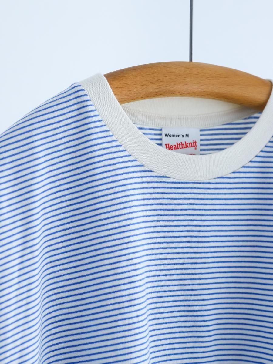 細いボーダーで、滑らかな綺麗めの生地感のTシャツ。
