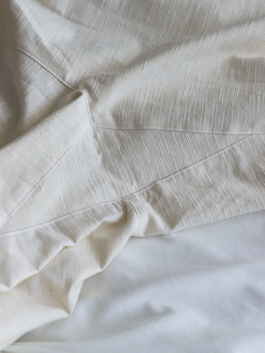 知多木綿生地の中でも"彩紬"と呼ばれる少し硬さのある生地で、スラブ糸という節のある糸を使うことで凹凸のある表情豊かな仕上がりに。