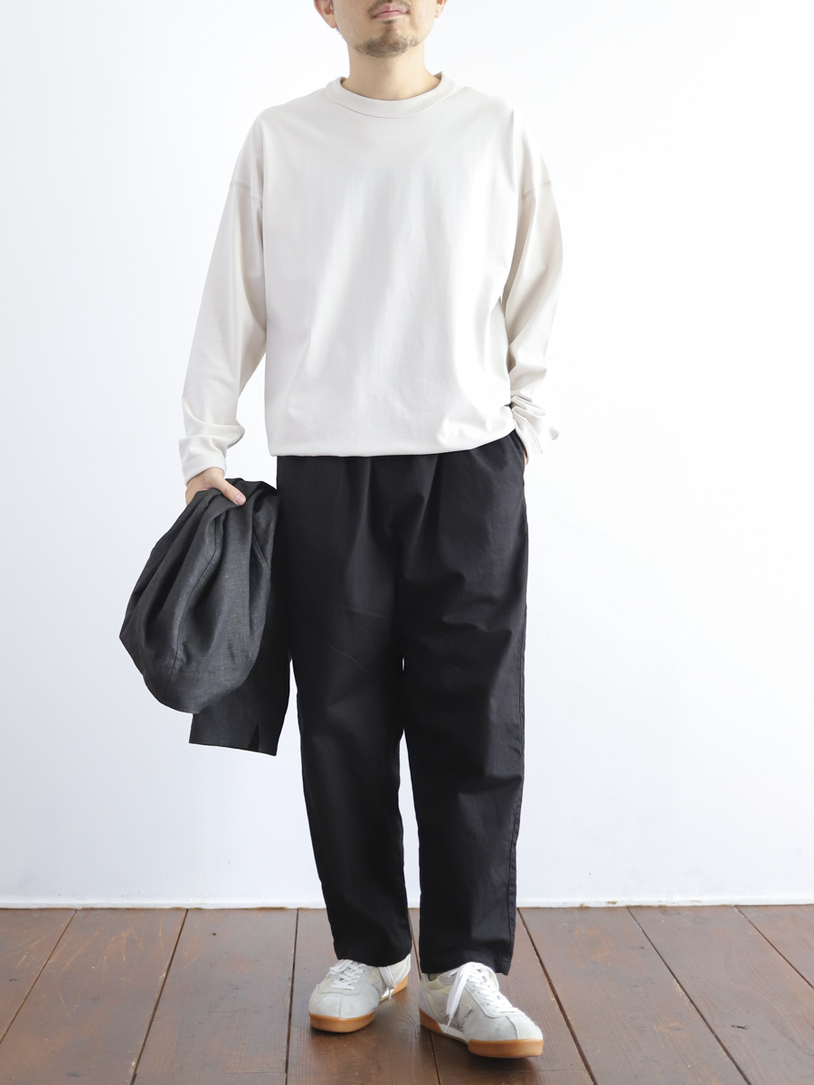 特徴的な裾のドローストリングで絞ることでシルエットのアレンジが可能で、生地と肌の間に隙間が生まれるため肌にまとわりつかず快適に着用できます。