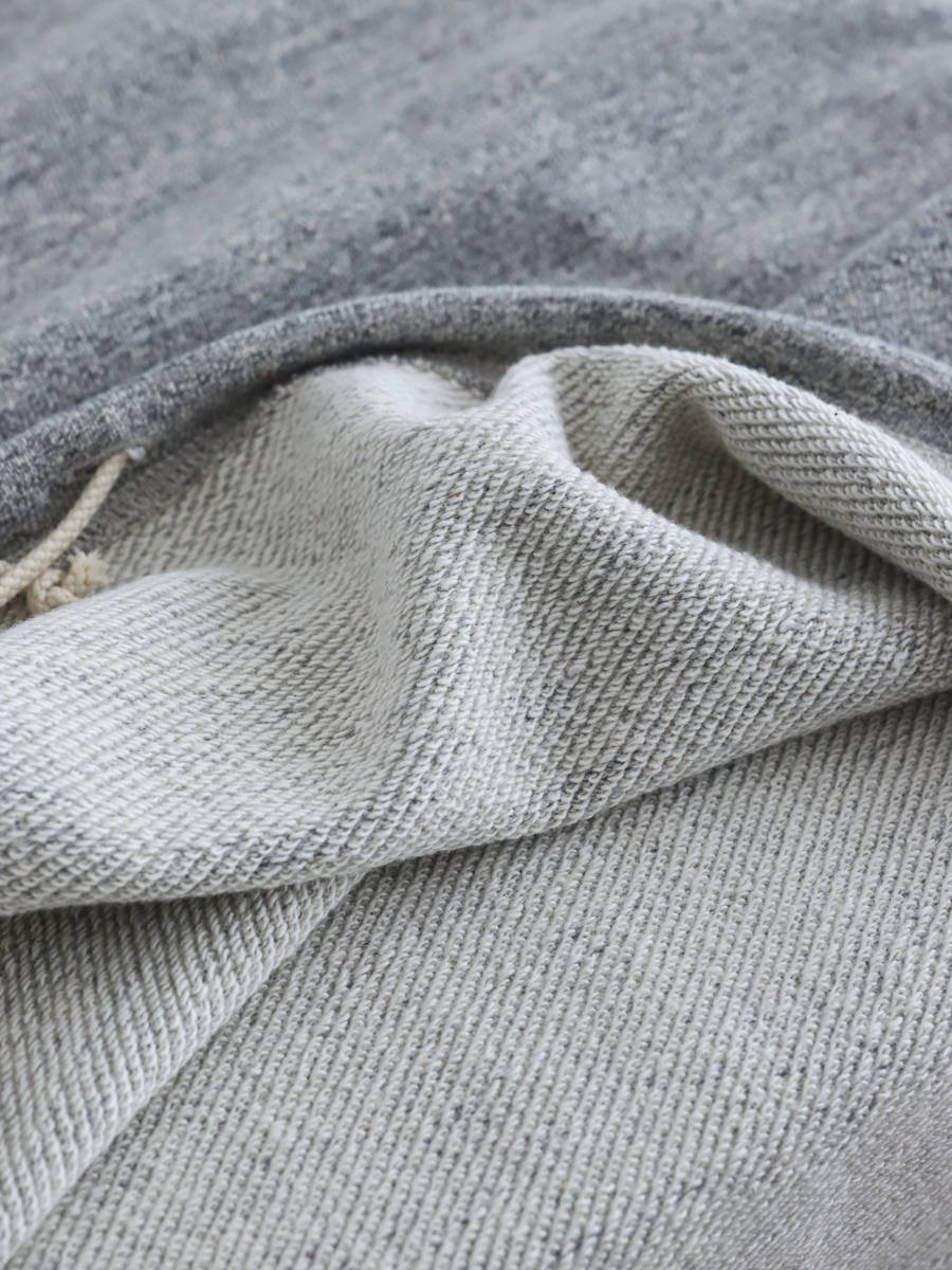 太番手の国産糸を使用し、日本国内で編み立てたGG(ガラガラ)裏毛(スウェット)素材。
