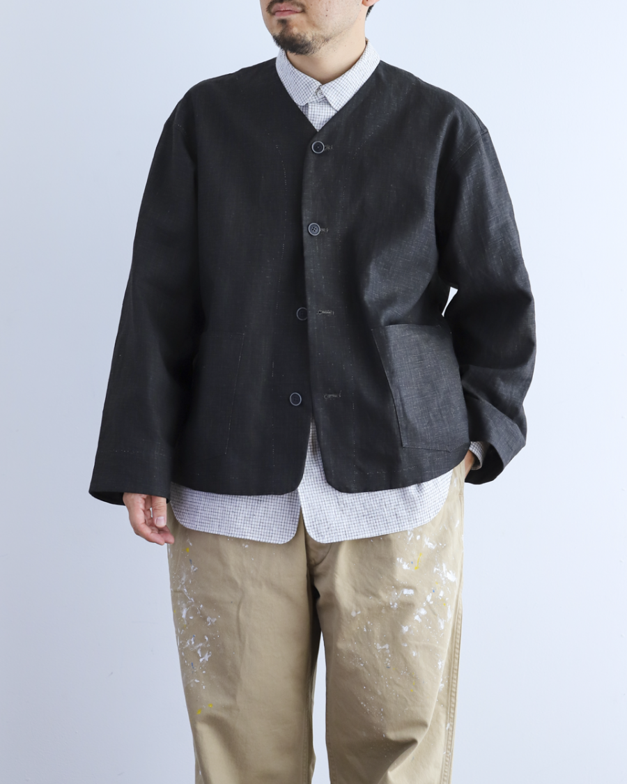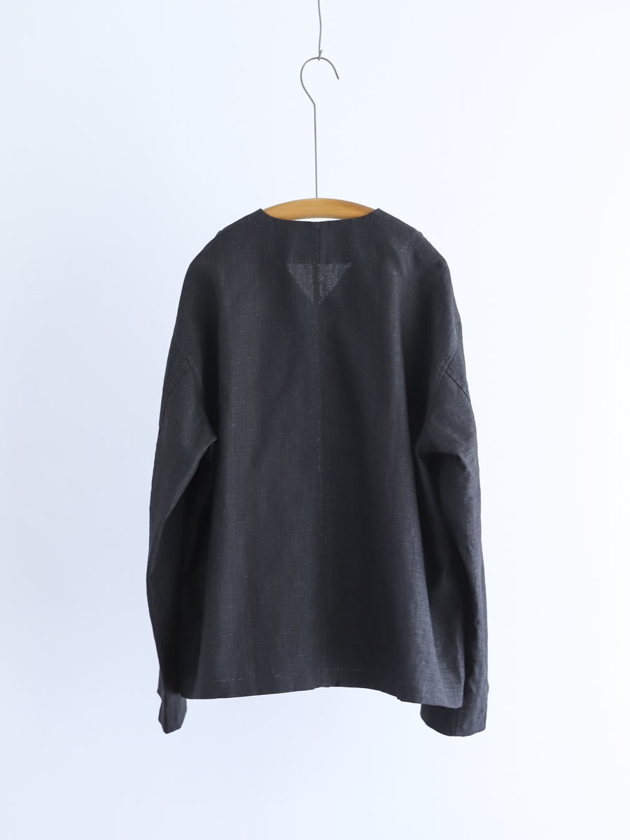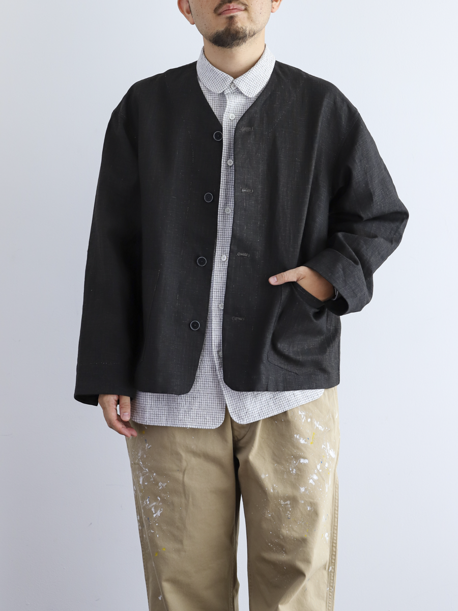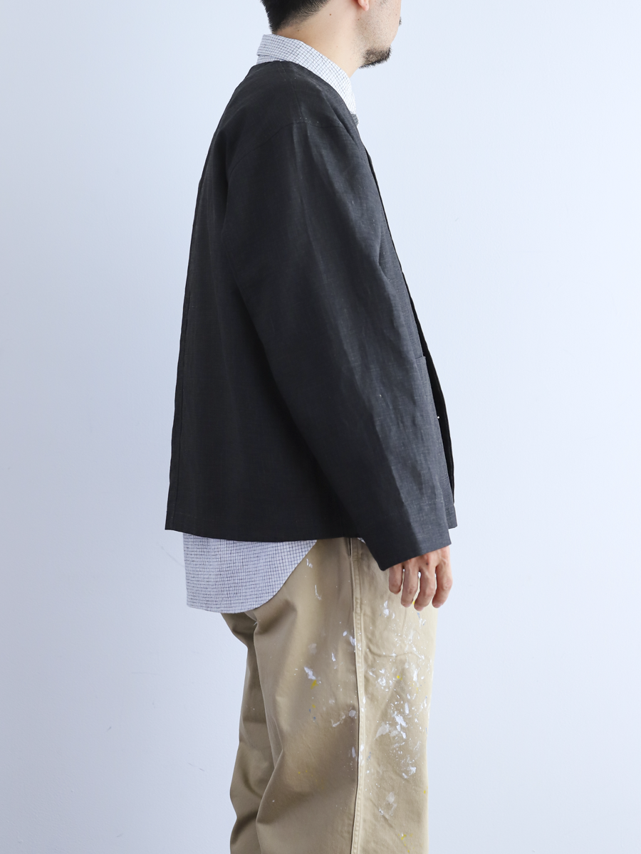 裏地なしの一枚仕立てでカーディガン感覚で気軽に羽織れるノーカラーのシンプルなジャケット。