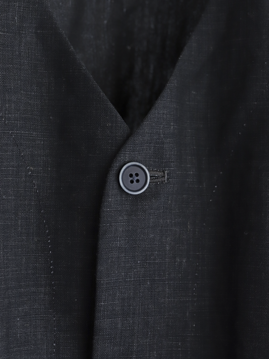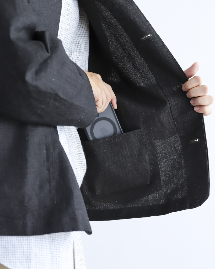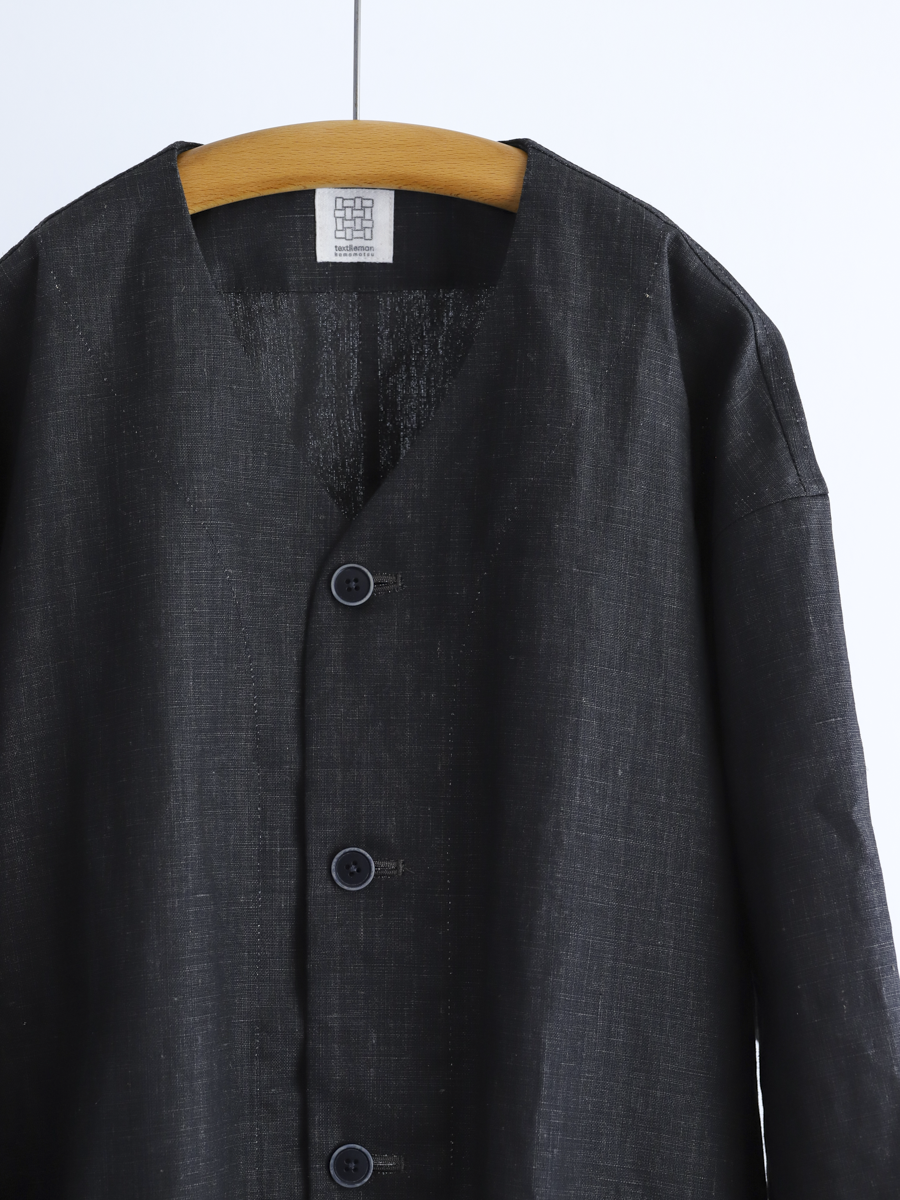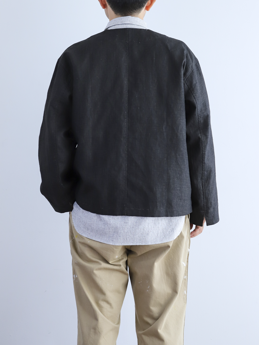 裏地なしの一枚仕立てでカーディガン感覚で気軽に羽織れるノーカラーのシンプルなジャケット。