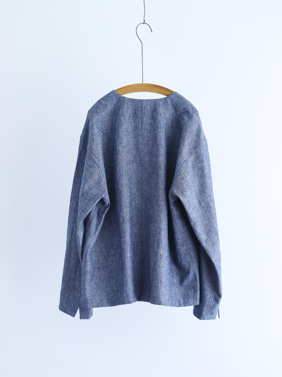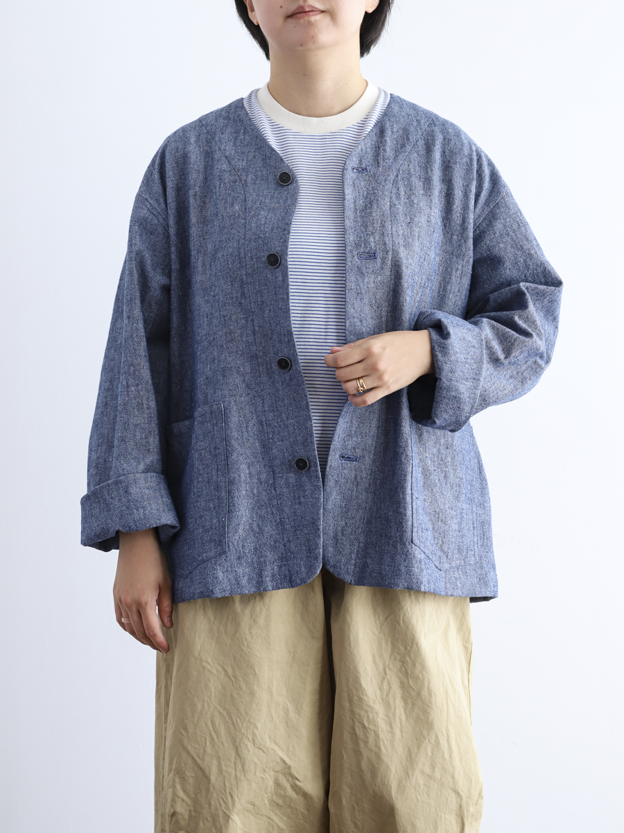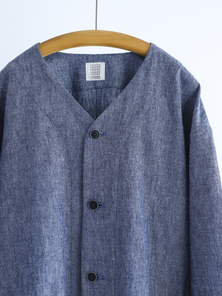裏地なしの一枚仕立てでカーディガン感覚で気軽に羽織れるノーカラーのシンプルなジャケット。