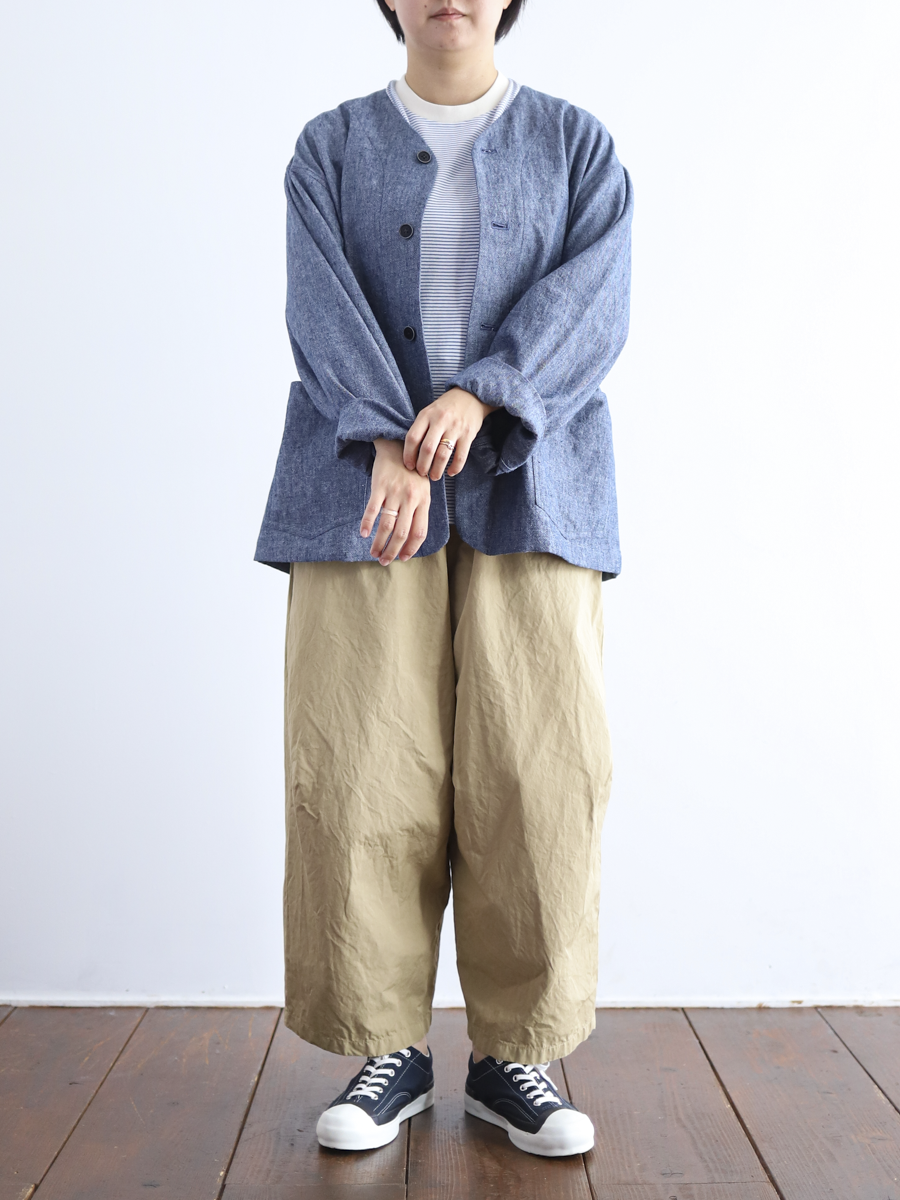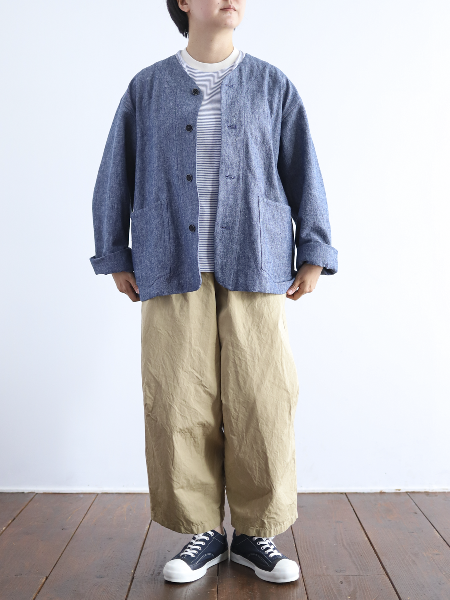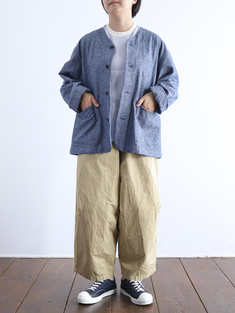 裏地なしの一枚仕立てでカーディガン感覚で気軽に羽織れるノーカラーのシンプルなジャケット。
