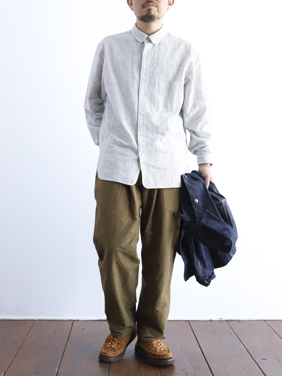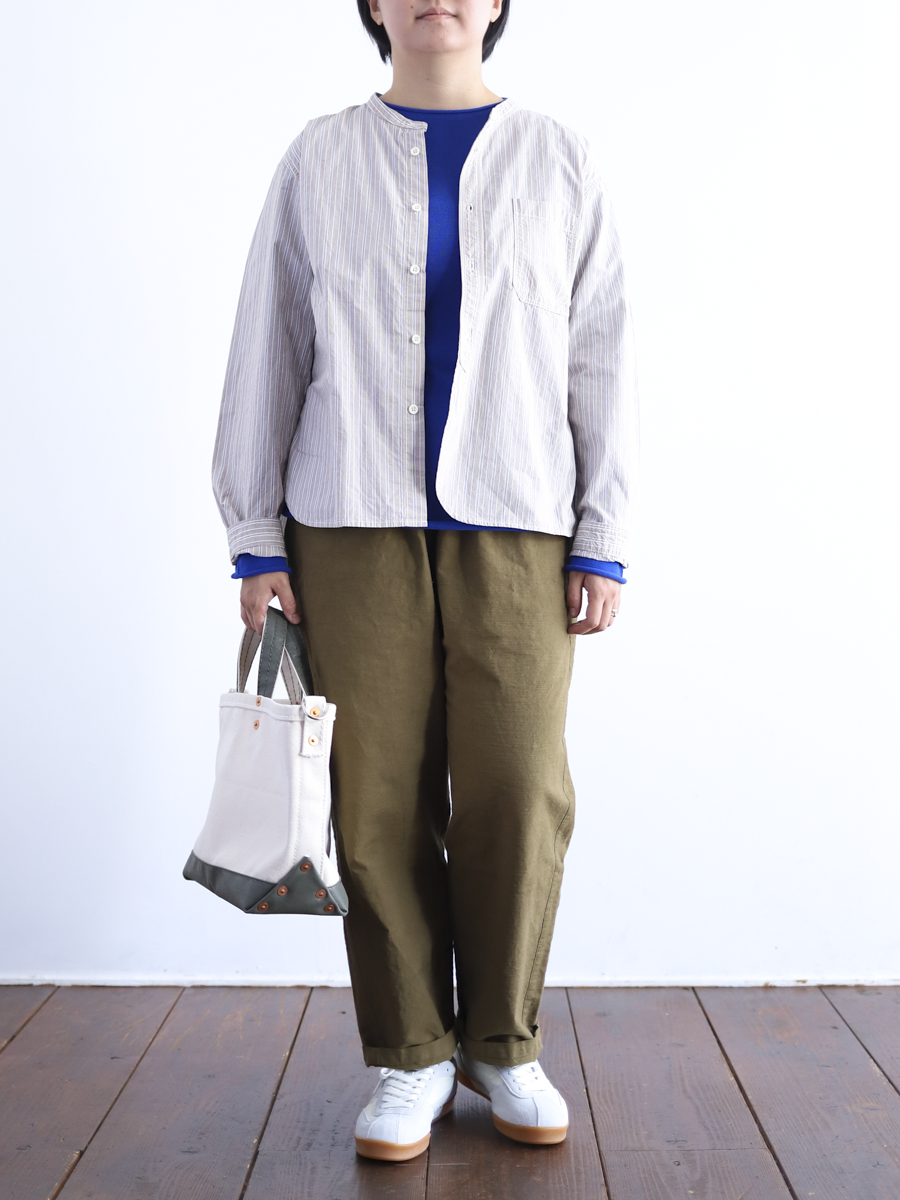 知多木綿生地の中でも"彩紬"と呼ばれる少し硬さのある生地で、スラブ糸という節のある糸を使うことで凹凸のある表情豊かな仕上がりに。