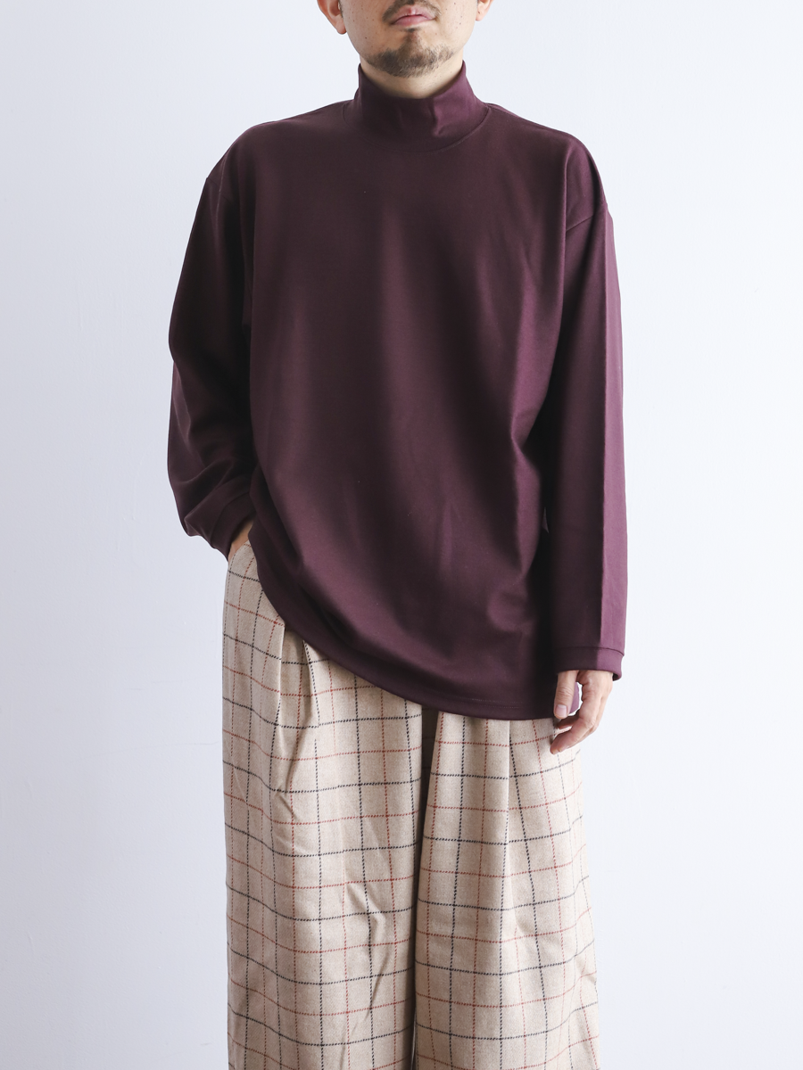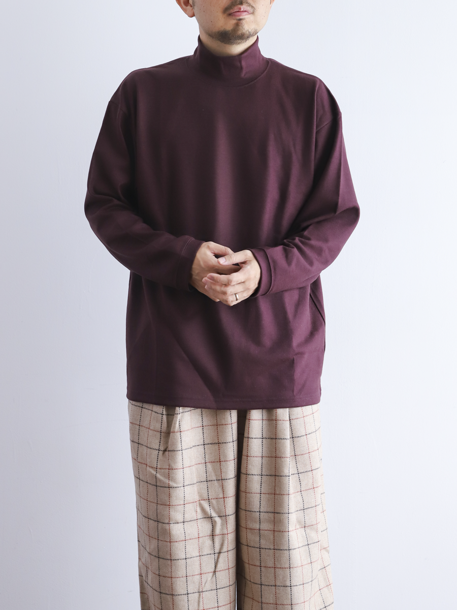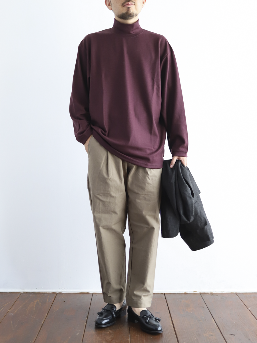 リブ素材で切り替えたハイネックが季節感と上品さをプラスしてくれるカットソー。